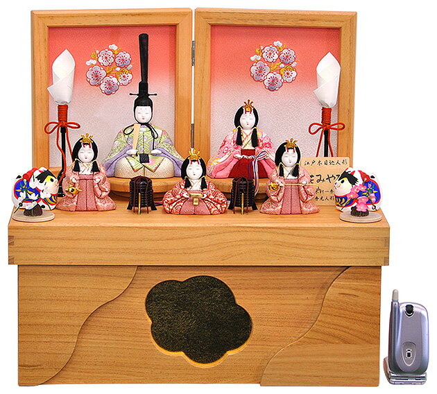 雛人形 木村一秀作・着物の柄と屏風に桜柄を使った春いっぱいの木目込み五人の収納式お雛さま♪